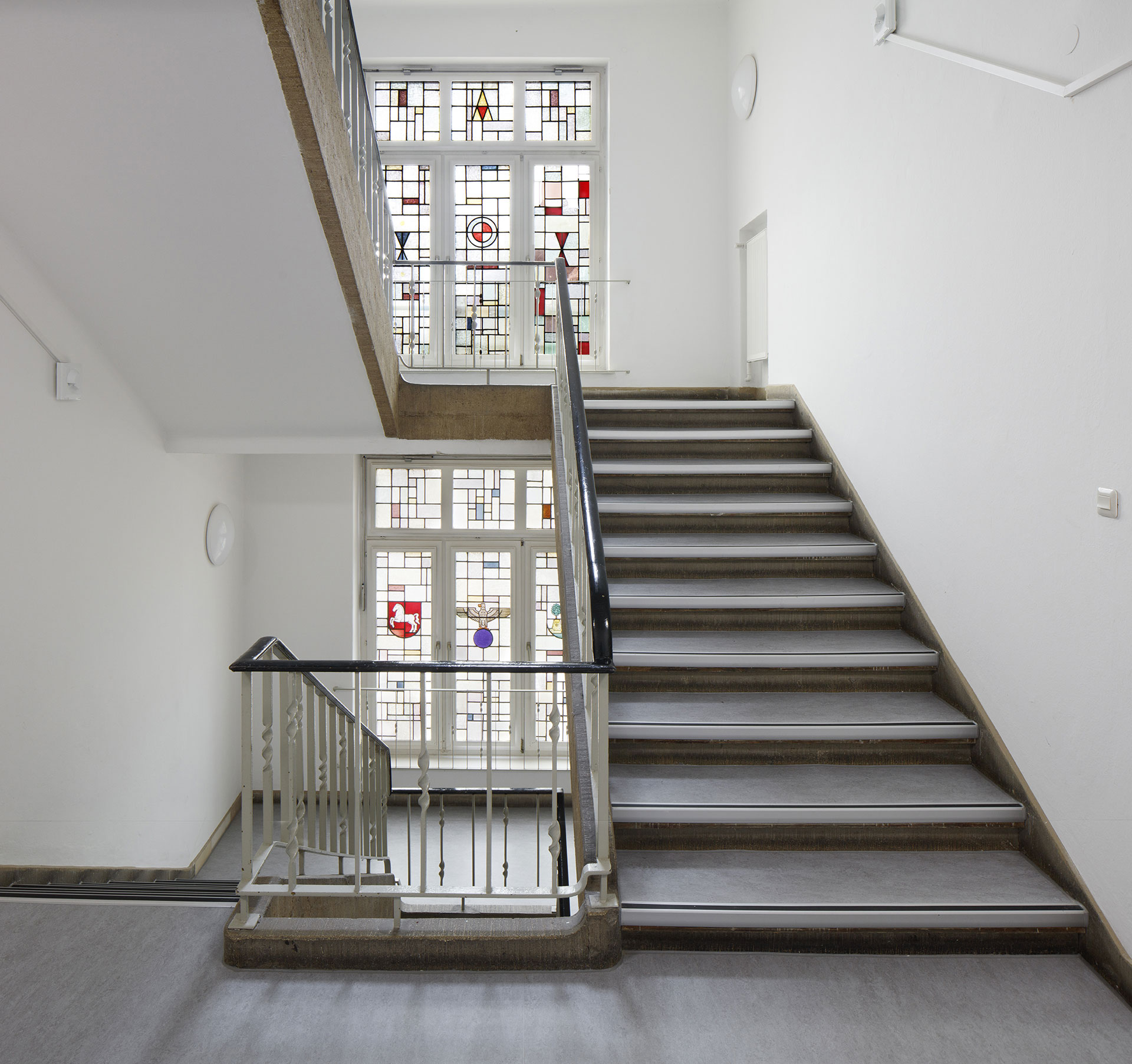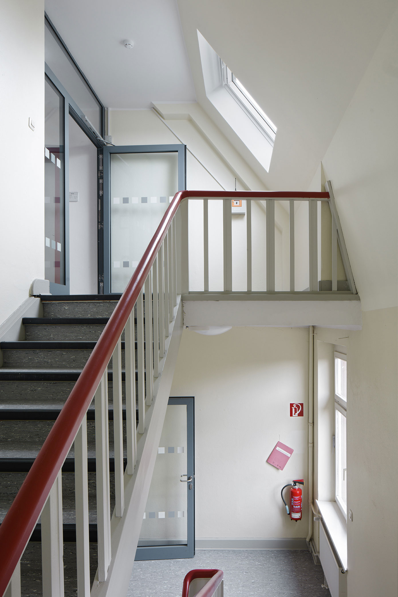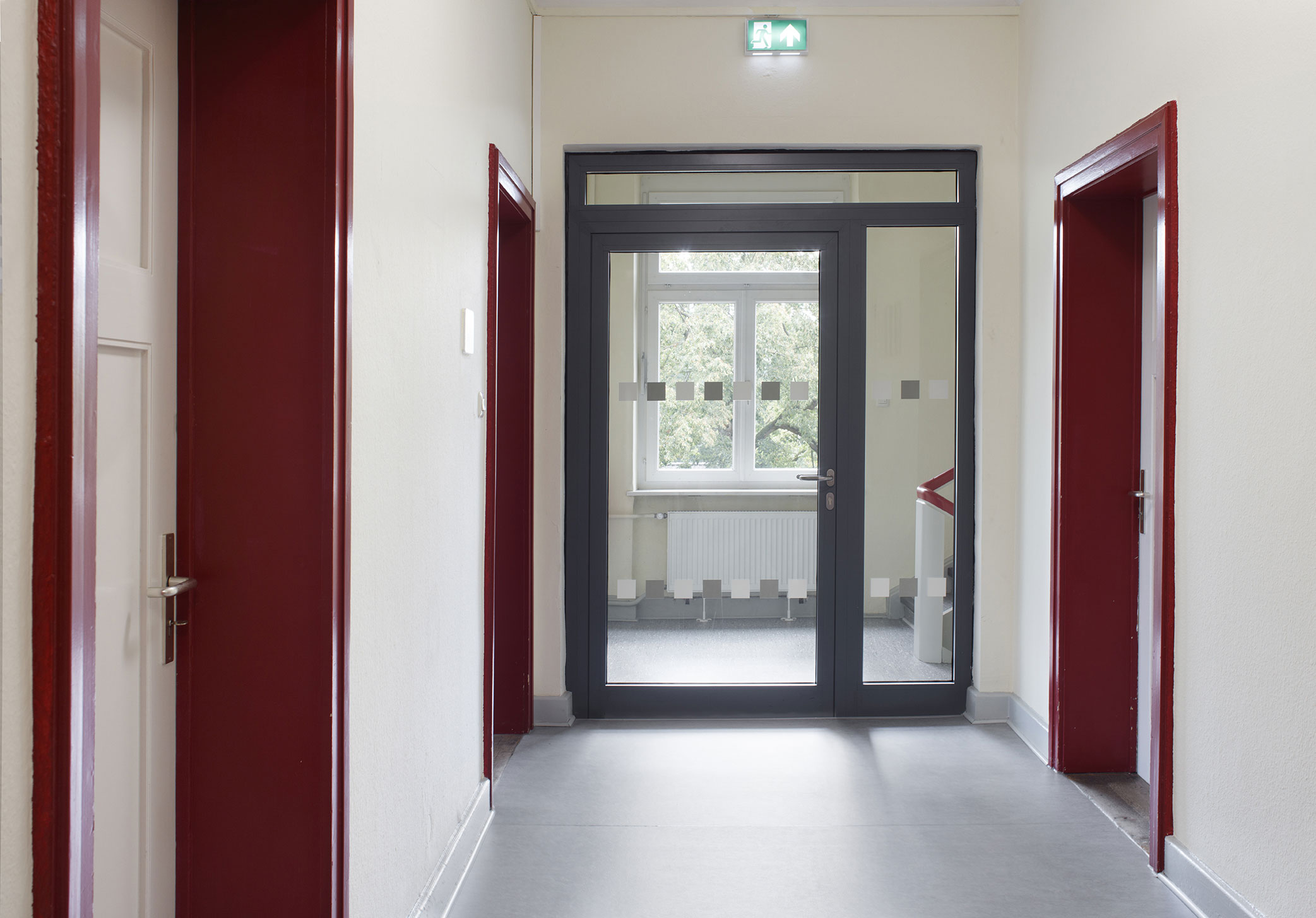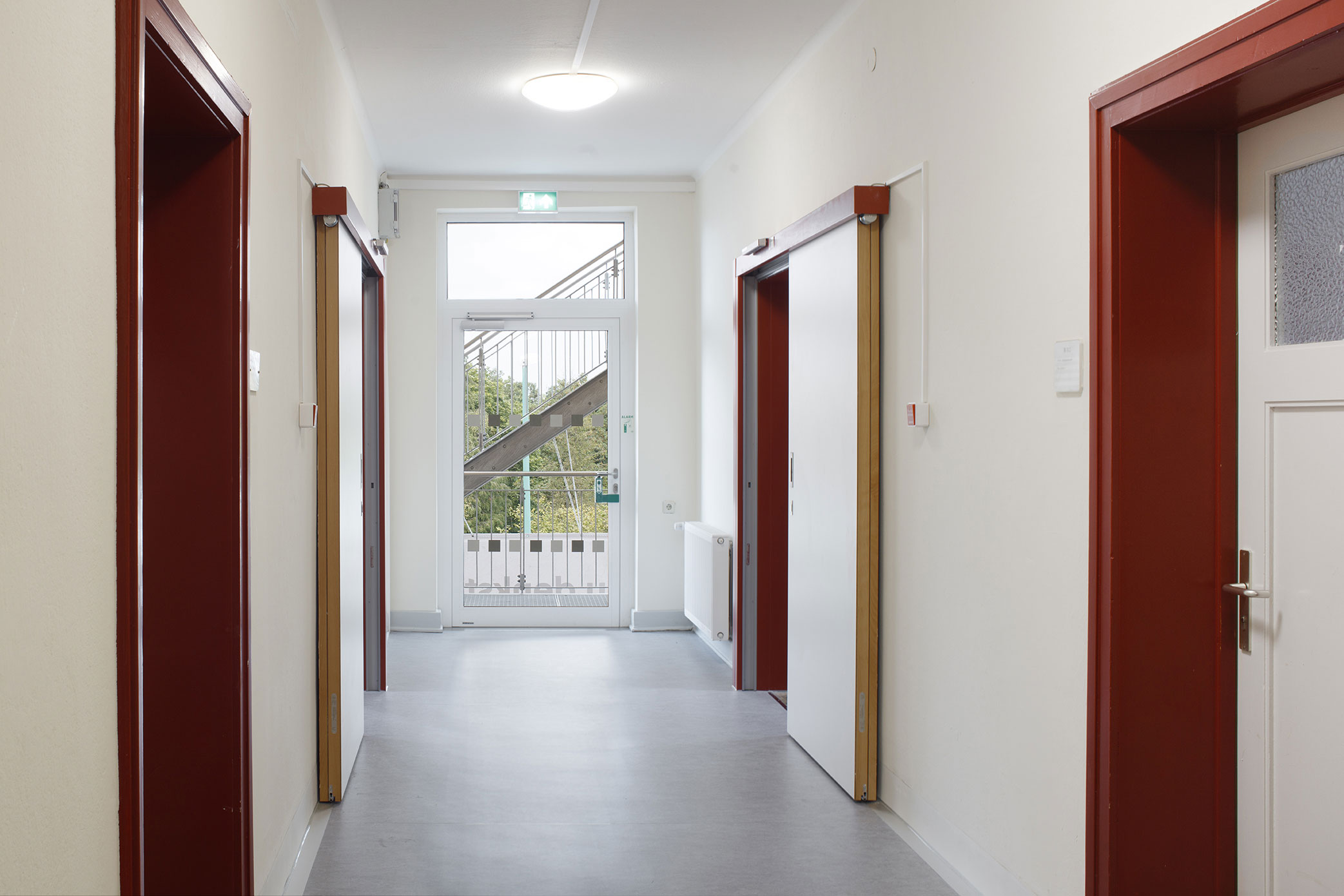 Die vorhandenen notwendigen Treppenräume wurden zudem umfassend baulich ertüchtigt. Dies umfasste die Ausbildung raumabschließender Bauteile mit entsprechender Feuerwiderstandsklasse, den Austausch der Türen zwischen den Nutzungseinheiten und den Treppenräumen sowie die Integration von Öffnungen zur Rauchableitung. Dadurch wurde sowohl der Personenschutz als auch die Rauchfreihaltung der Rettungswege deutlich verbessert.