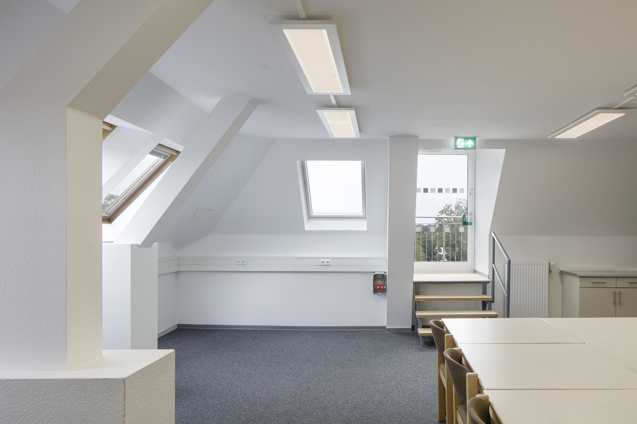 Im Zuge der Maßnahmen erfolgte außerdem eine gestalterische und funktionale Neugestaltung des Eingangsbereichs sowie der Poststelle. Diese Bereiche wurden räumlich neu organisiert, sodass sich die internen Abläufe optimieren ließen und gleichzeitig eine klare Besucherführung und ein freundlicher Empfangsbereich entstanden.