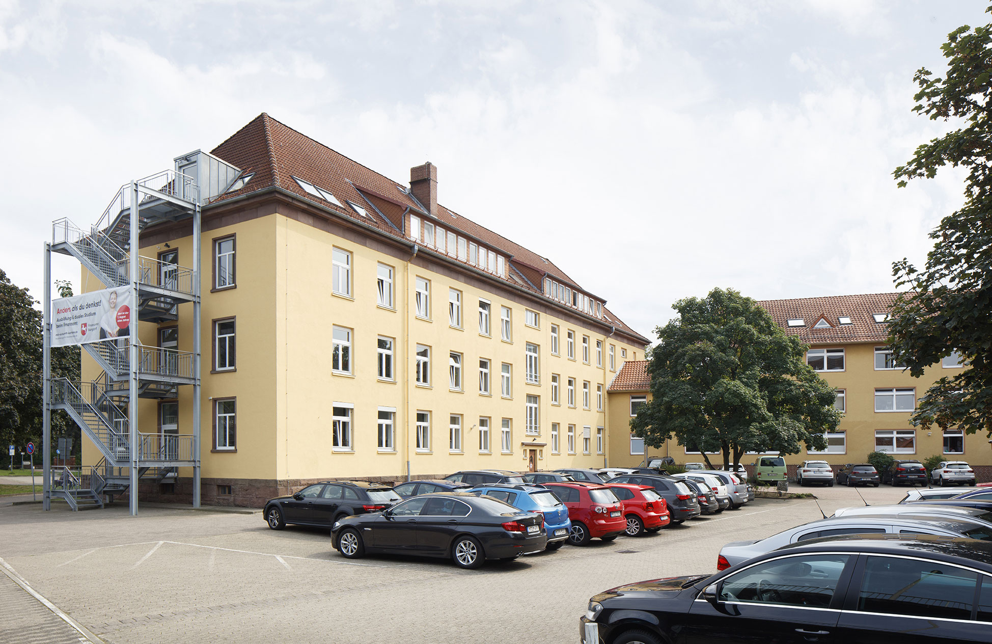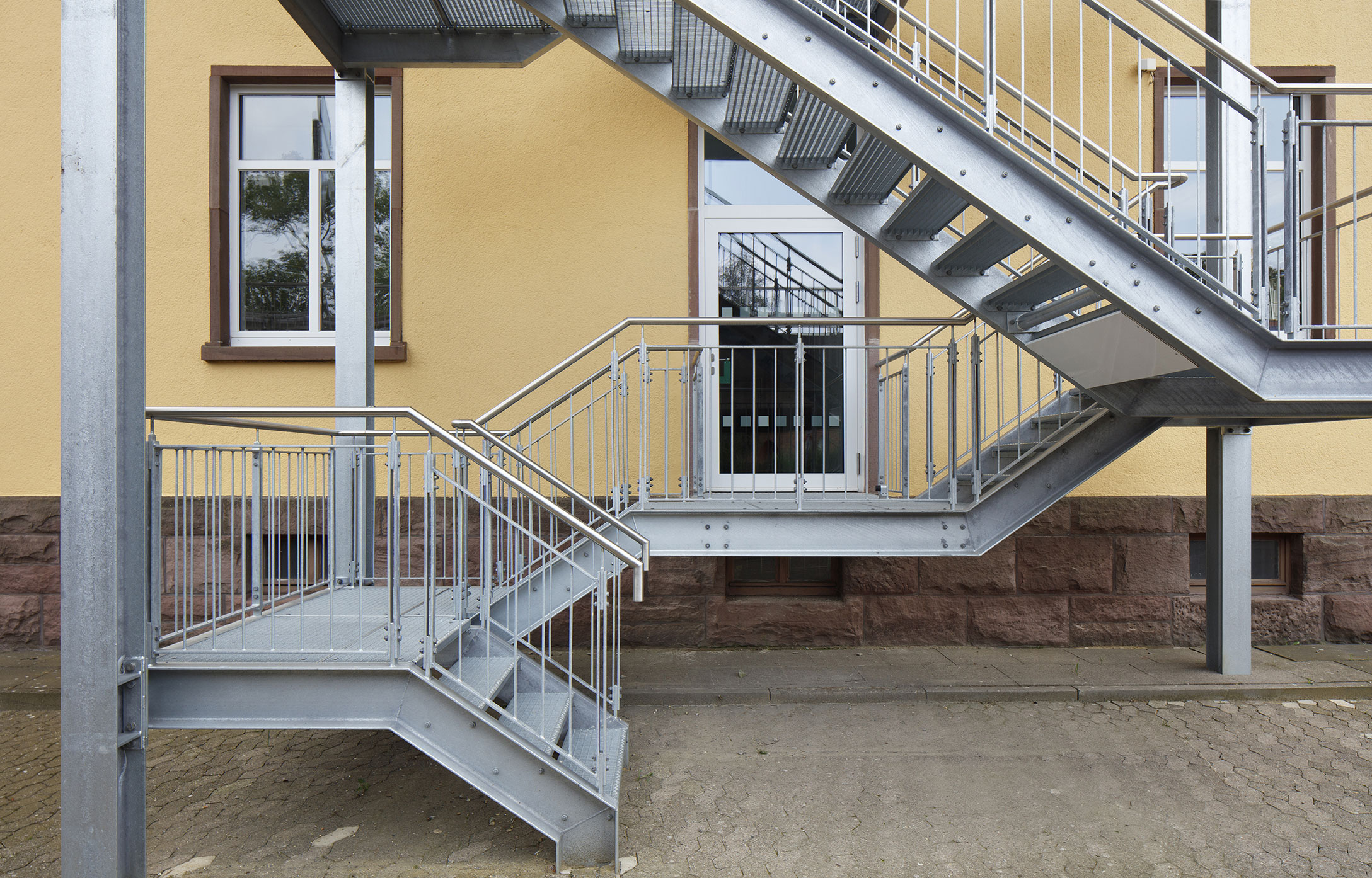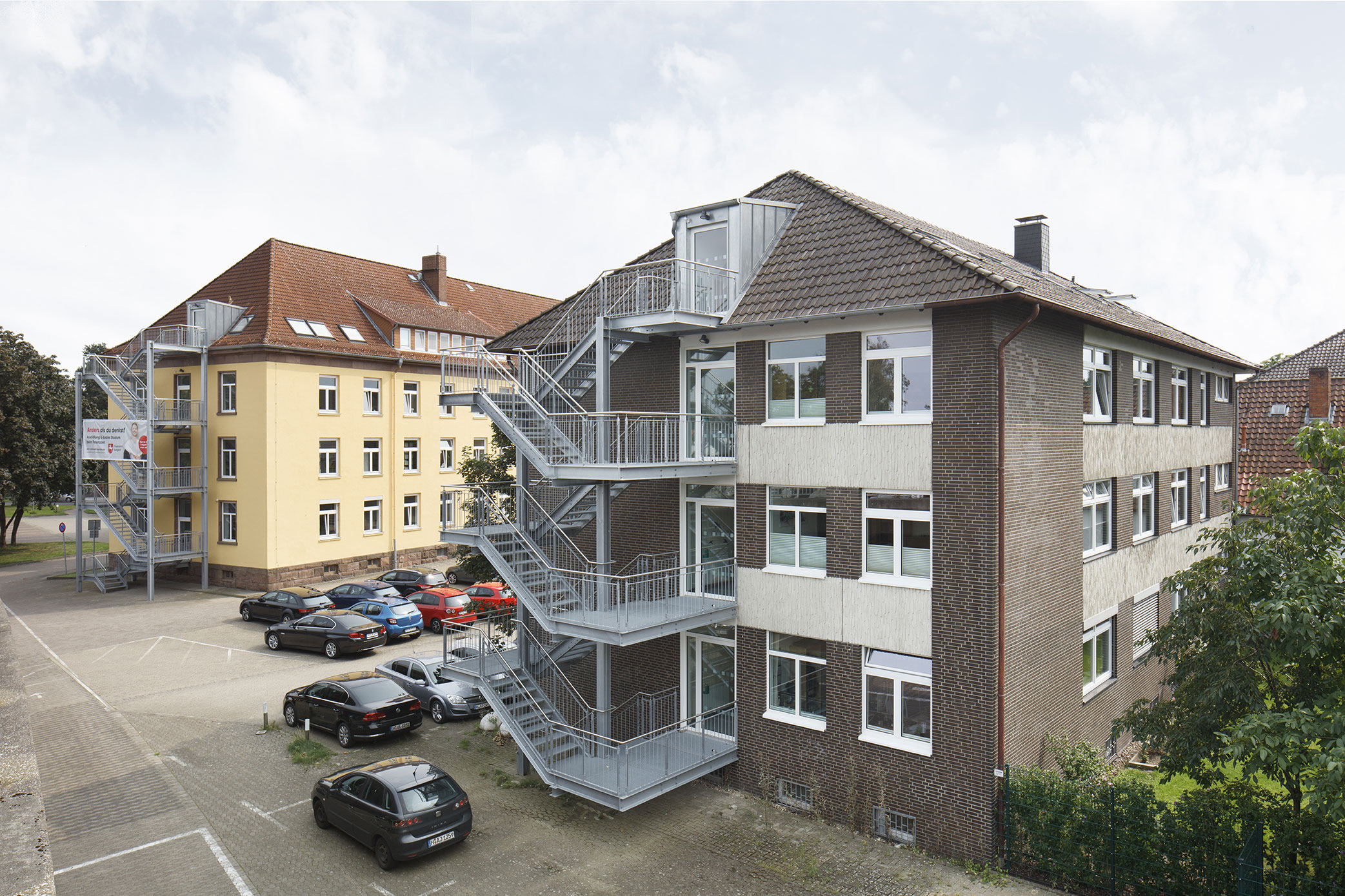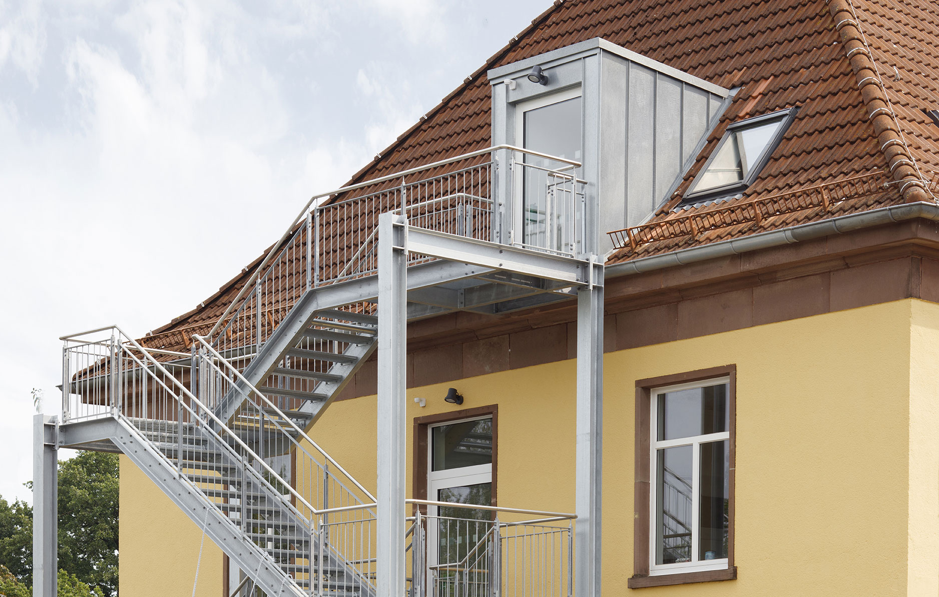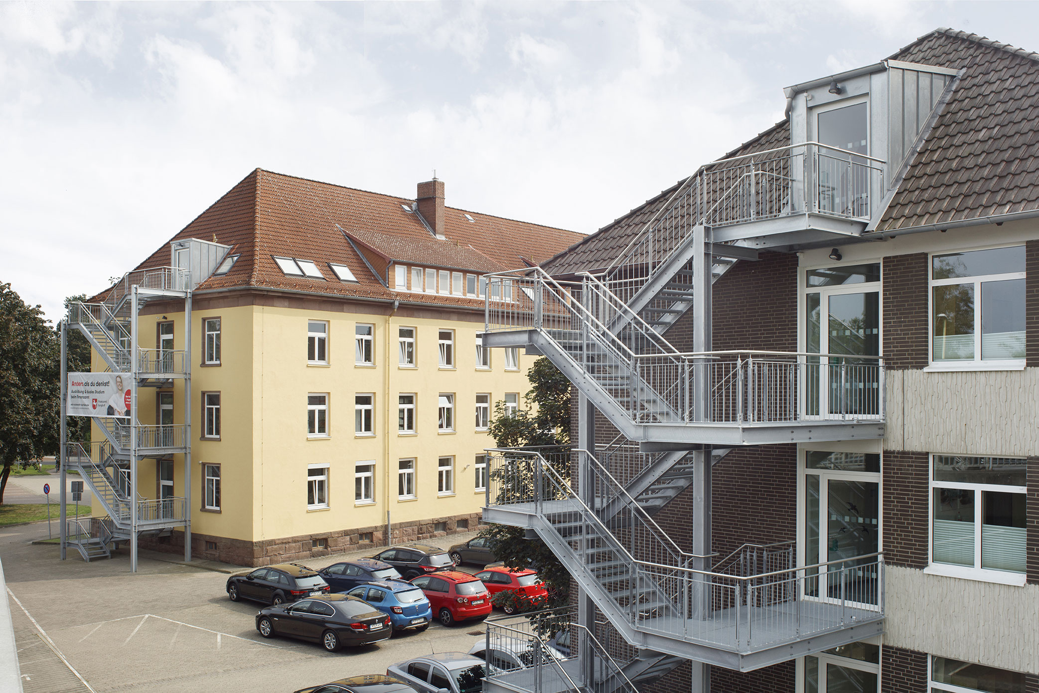 Ein wesentlicher Bestandteil der Maßnahme war die Ergänzung fehlender baulicher zweiter Rettungswege. Hierzu wurden neue außenliegende Treppenanlagen geplant und an die Bestandsgebäude angebaut, um im Brandfall sichere und unabhängige Fluchtmöglichkeiten zu gewährleisten.